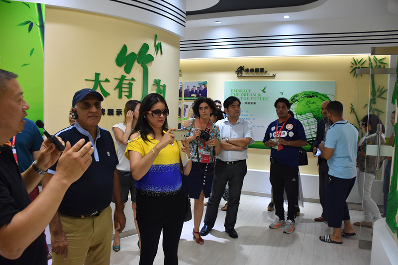在斑布展廳,外賓及陪同領導在斑布負責人的帶領和講解下,從竹產業的發展到斑布對竹產業的開發利用以及斑布對產品的創新都有了一個全新的了解和認識。