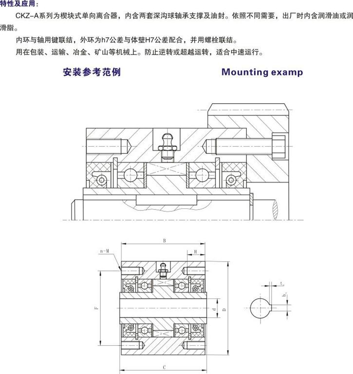 CKZ-A系列楔塊式單向離合器,內(nèi)含兩套深溝球軸承支撐及油封。