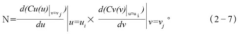 降維插直法_是從已知的數(shù)字化離散曲面出發(fā),將數(shù)字曲面分別沿下同的方向u,v構(gòu)造一個整體上具有二階連續(xù)導(dǎo)數(shù)的三次樣條插直曲線。兩條交叉的插直內(nèi)線在交叉點的切向量的向量積,_是數(shù)字化曲面在這一點的法向量N,如圖2-25所示。根據(jù)三次樣條插值的特性,由曲線插值所求得的法向量是相等的。然后按照曲面相對運動過程的共軛條件,建立求解_小值數(shù)學(xué)規(guī)劃模型,應(yīng)用優(yōu)化算法,即可求得與已知數(shù)字曲面Σ1、相共軛的數(shù)字化曲面Σ2。
