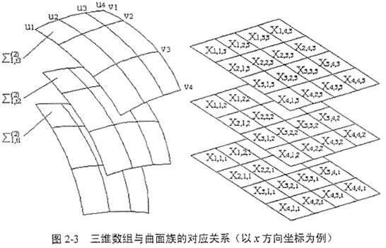 設(shè)此三維數(shù)組為M,則取t≡tk時,M退化為一個二維數(shù)組,它表示曲面族{Σ1}中對應(yīng)t=tk的曲面;如果考察已知曲面上一點(ui,vj),即取u≡ui,v≡vj,則M退化為一維數(shù)組,它表示曲面一點(ui,vj)在坐標(biāo)系S2中對應(yīng)于運動參數(shù)t的一系列位置向量,也即點(ui,vj)在坐標(biāo)系S2中的離散運動軌跡。